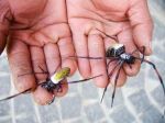 The spider is clamped by a sheet of wood with a half-moon aperture for its abdomen. In each hand-powered contraption are 24 females (they are always female). Handlers pull and spool strands from each spider’s multiple spinnerets. A gossamer thread is made from 96 twisted strands.
