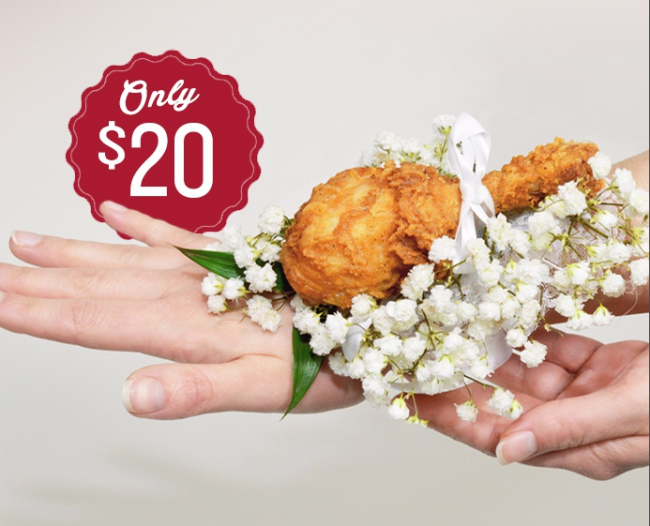 Launched in collaboration with a Kentucky-based florist, the corsage costs $20 and comprises a spray of baby’s breath and a $5 KFC voucher (due to freshness issues). Thank God, there isn’t really chicken on the wrist!