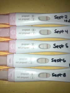 Then you wait for your transfer date. Post transfer, you have the dreaded two week wait (TWW) during which you torture yourself with trying to read into every symptoms or lack of – “my boobs hurt yesterday but they’ve stopped hurting now”, “I pee more”, “I pee less”, “I have cramps”… and you worry yourself crazy about the embryo sticking. Some tries, I’ve been able to control my madness and only take ONE home pregnancy test before the BETA (day on which the doctor draws blood to see your HCG levels – a hormone only produced when pregnant). Other times, I’ve been so anxious I tested EVERY DAY and compared the lines to see if they were darker than the previous (see photo – the subtleties can hurt your eyes!). The wait makes you worry about everything. You find yourself asking Google all the questions you don’t feel like bugging your doctor with – “implantation foods”, “exercising after implantation”, “shall I test morning or night (or both)?”, “HCG levels week 4”, “early pregnancy symptoms”, “is a lack of symptoms bad?”, “symptoms of miscarriage”, “what is a chemical pregnancy”, “should the lines on the test get darker”… after reading all the answers to all your questions on google, you repeat the exercise in community chat rooms where thousands of other women have been trying to conceive and have the same worries!! It’s torture!!! But it’s also calming and helpful… the wait is easier when you busy your mind!!